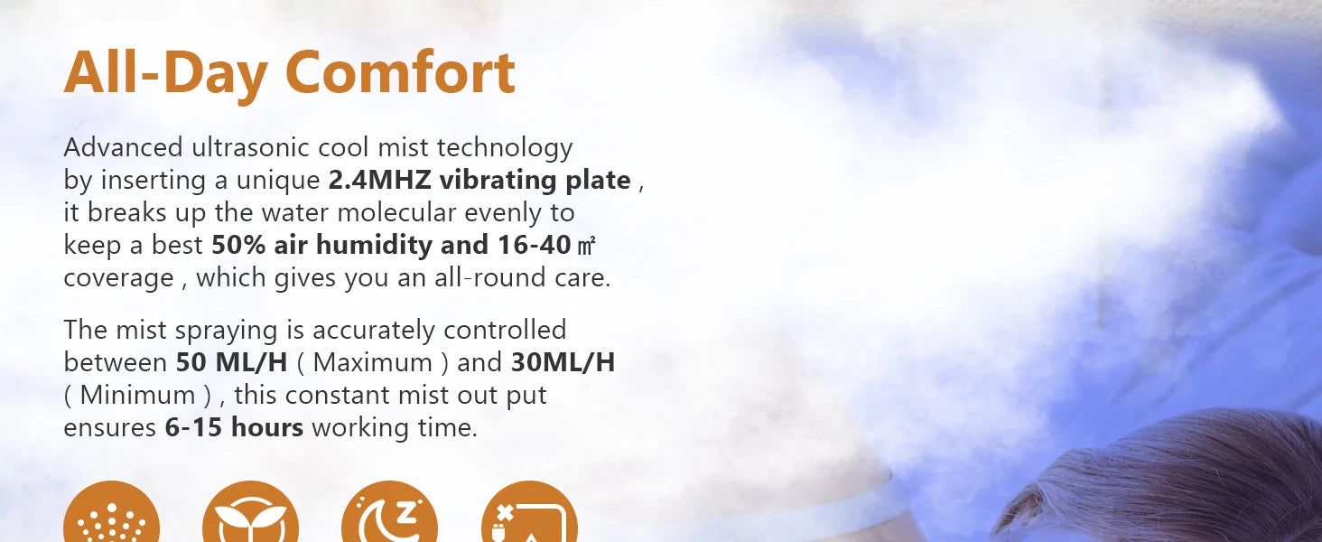-Refresh indoor air: You can refresh the air through the aroma diffused by the ultrasonic humidifier.