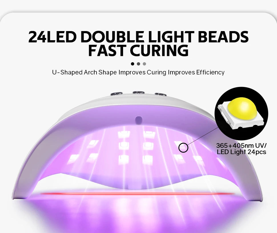 【Fast & effective】 uv nail lamp with 24pcs double light source beads, can dry the whole hand or foot evenly including the thumb at once.Nail dryer with LCD digital screen, real-time display drying seconds.